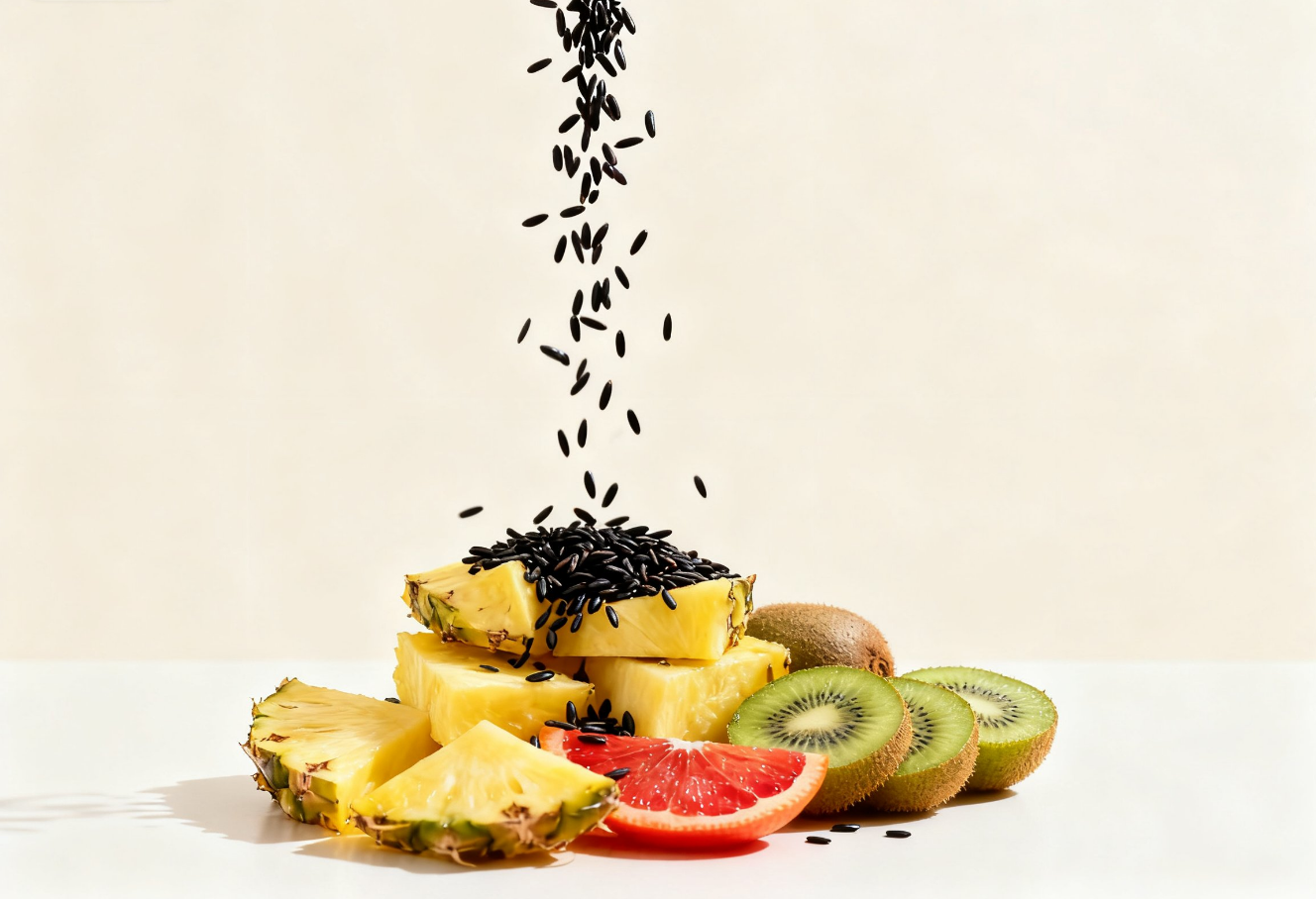 黑米菠萝复合粉是一种科学配方的天然混合物,源自四种强效天然成分:黑米、菠萝、猕猴桃和红橙。这些成分在传统保健和护肤中均有悠久历史。黑米在古代中国被称为“禁米”,因其高抗氧化成分和促进血液循环的功效而备受推崇。菠萝在热带地区传统上被用于帮助消化和抗炎,这得益于其中的菠萝蛋白酶。猕猴桃原产于中国,以其高维生素C和纤维含量闻名,有助于皮肤健康和消化。红橙是地中海饮食的重要组成部分,以其黄酮类化合物帮助调节代谢和血管健康而著称。这些植物成分共同形成一种协同复合物,既尊重了它们的传统根源,又将它们的全面益处带入现代营养保健品科学中
